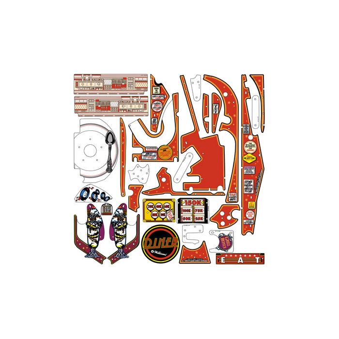 This new, 30-piece extended set, genuine 13-color ink-silkscreened on laser cut PETG includes all the essential artwork pieces, plus all the printed-clear plastics and the regular clear plastics. Bonus pieces include DINER "speaker cutout" and a key fob. Vivid colors and brand new, perfect replacement for scratched, yellowed, broken or incomplete Diner plastic sets.